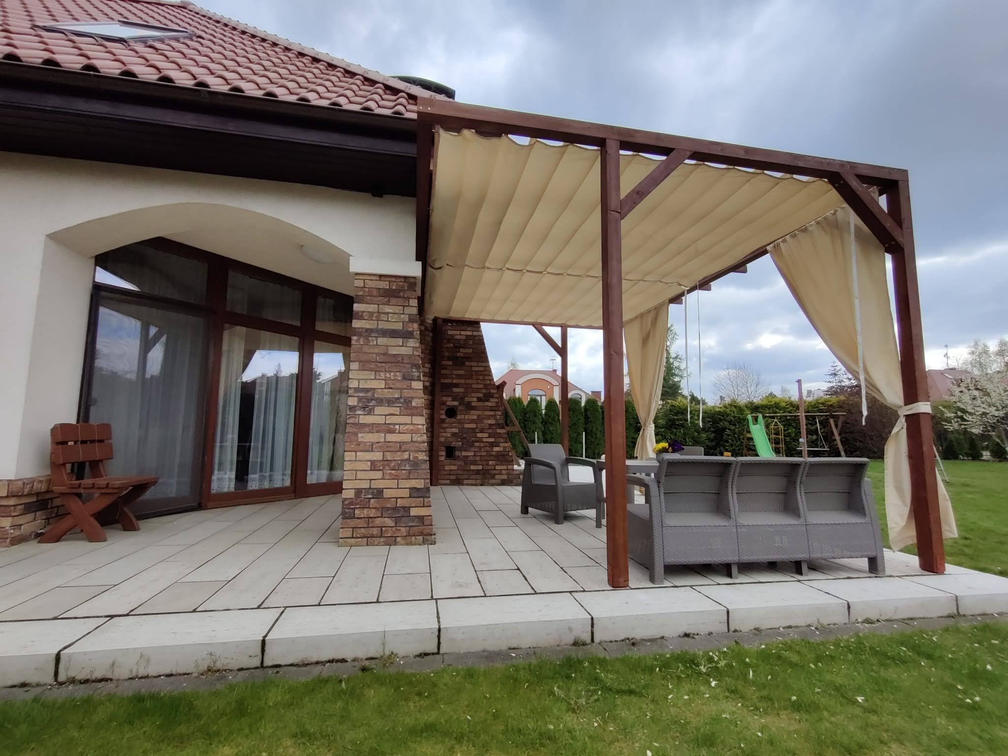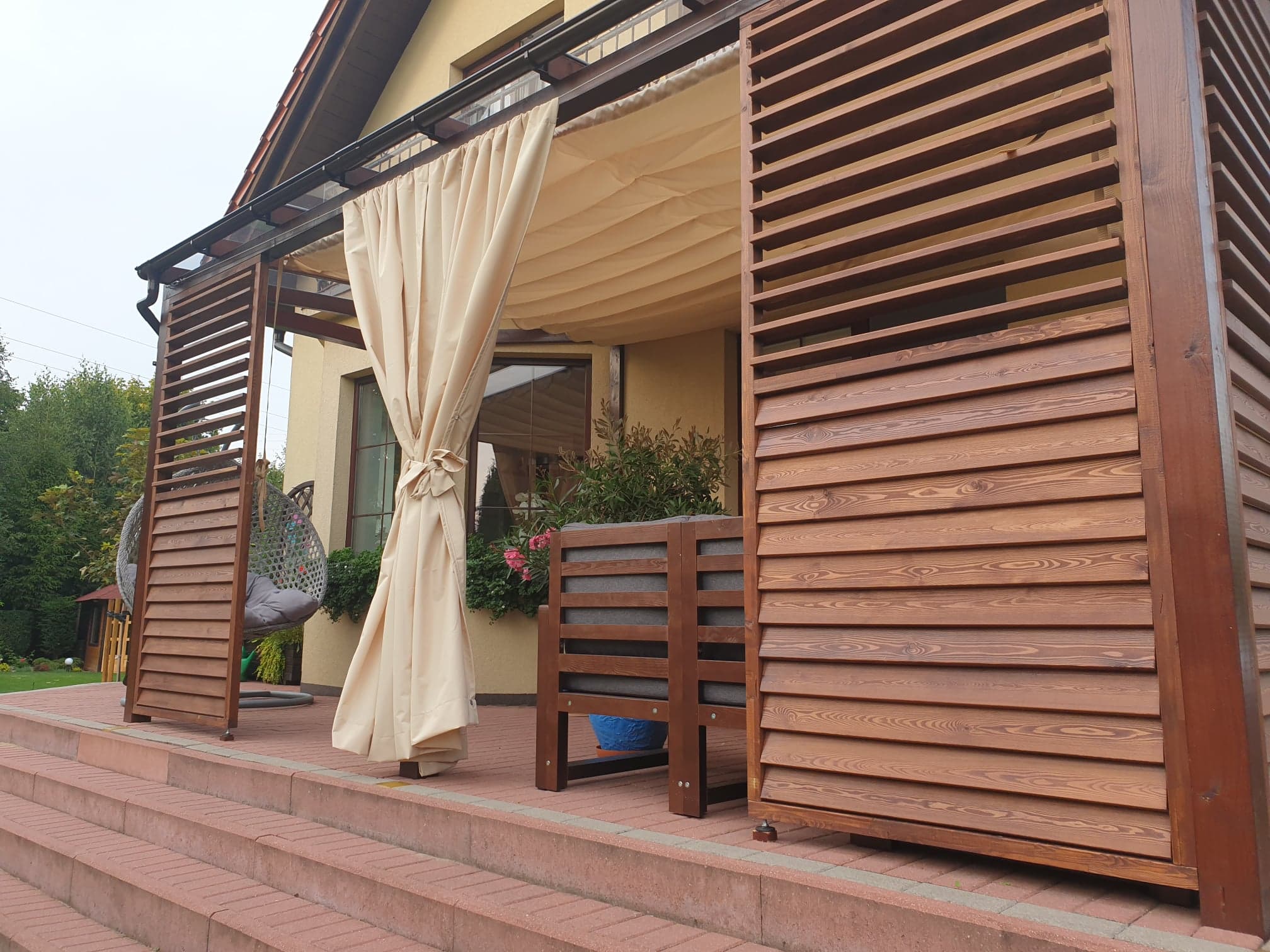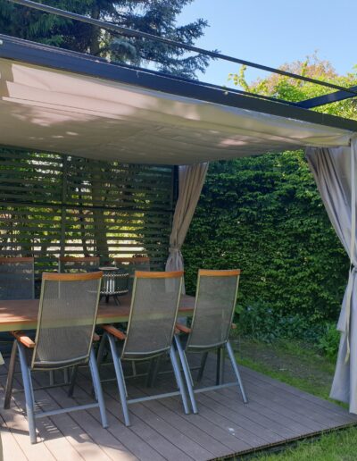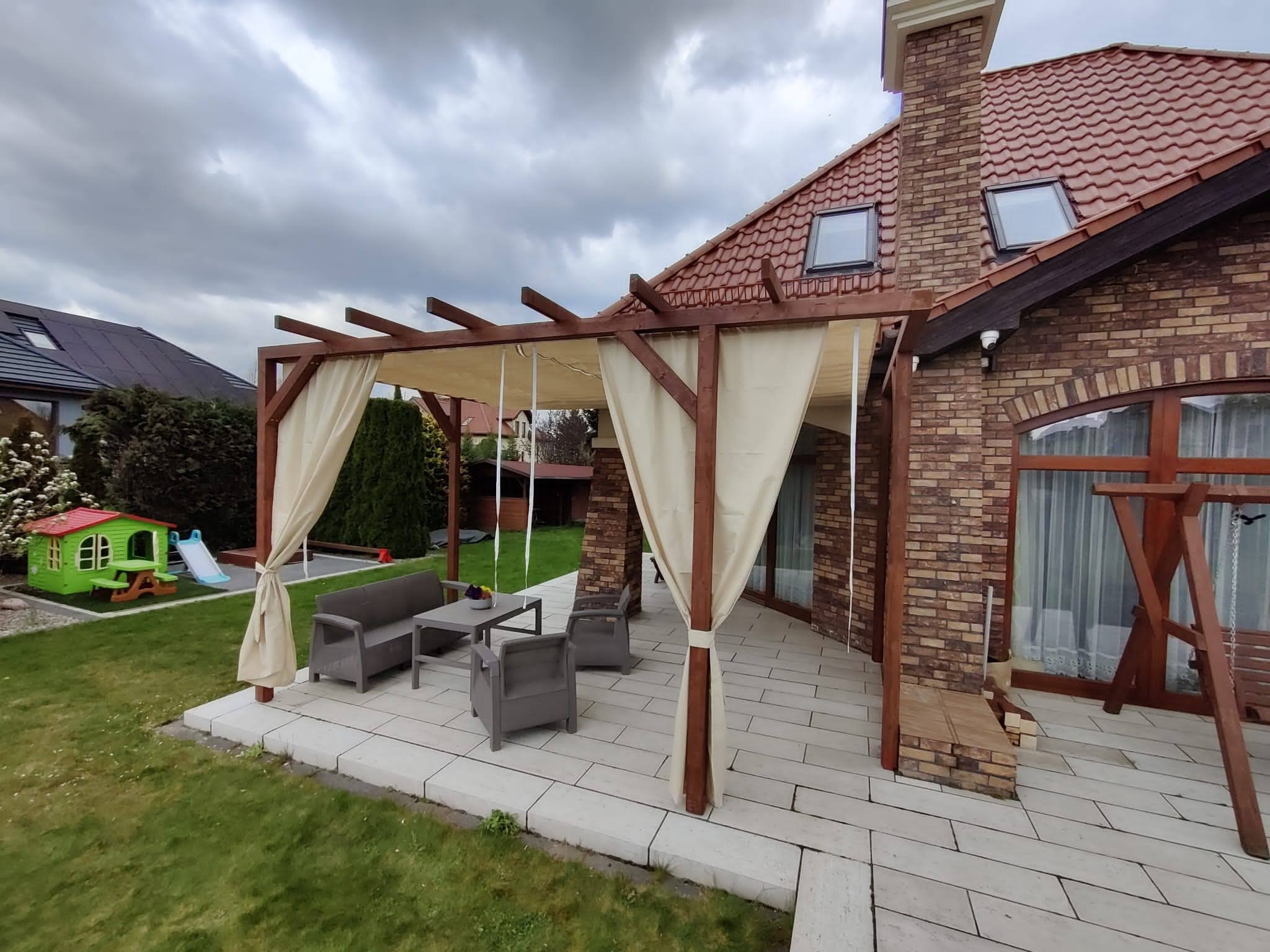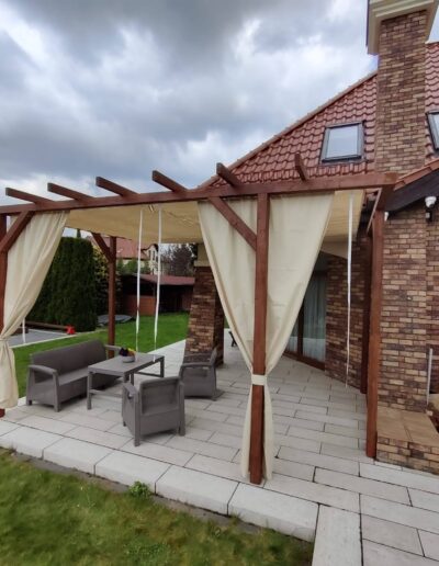 - Zasłony (dodatkowo płatne) dostępne w komplecie zapewniają również ochronę przed wiatrem,