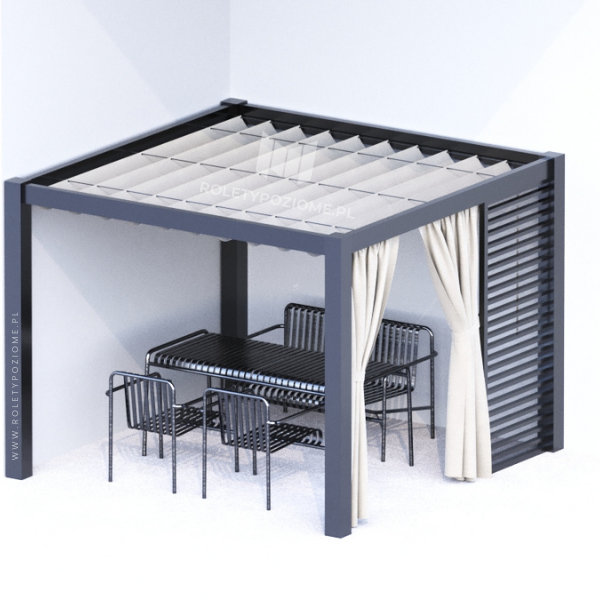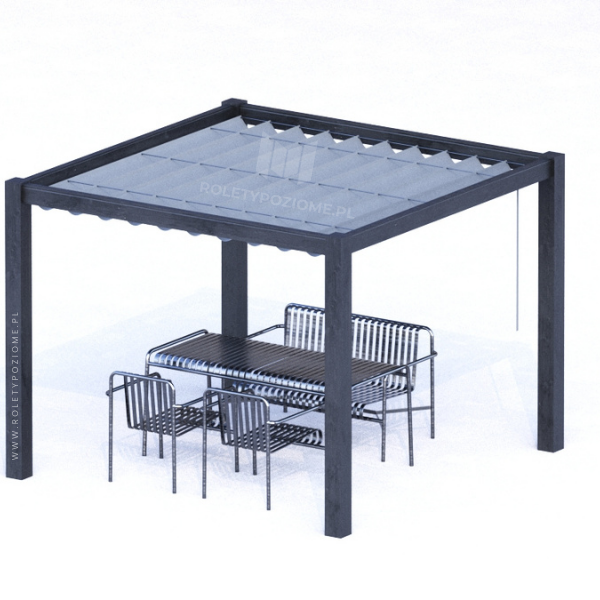 W zestawie znajduje się roleta z kieszenią na rurki aluminiowe, linami, systemem mocowania oraz aluminiowymi rurkami.